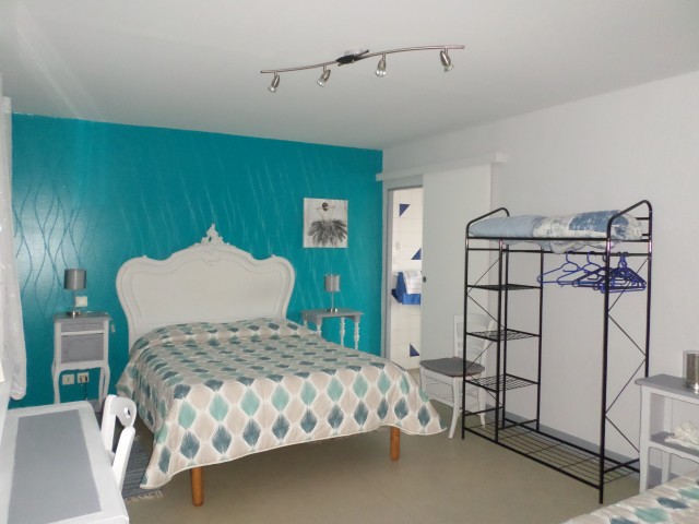 Très grande chambreavec 1 lit double et 3 lits de 90.Salle de bain avec baignoire.Toilettes séparées.