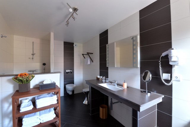 -une grande salle de bain avec douche à l'italienne en galets de marbre, un plan de toilette en granit avec lavabo incoporé, WC suspendu, sèche serviettes électrique, sèche-cheveux.