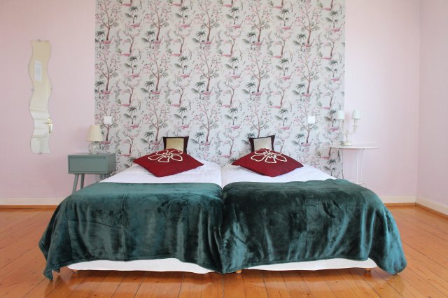 Chambre spacieuse, ambiance rose / crème / fleurs avec 2 lits jumeaux et un canapé lit de 100x190.Possibilité de rajouter 1 lit d'appoint ou 1 lit bébé. Belle salle d'eau avec douche, lavabo, WC.