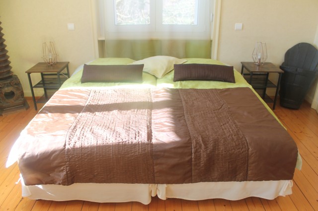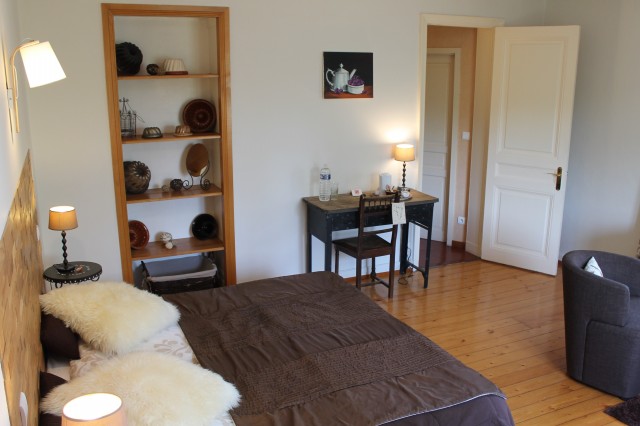 Grande chambre lumineuse décorée sur le thème du vin, avec 2 lits jumeaux + 1 lit individuel, fauteuils, salle de bain avec douche à jet. Possibilité de rajouter un lit bébé.