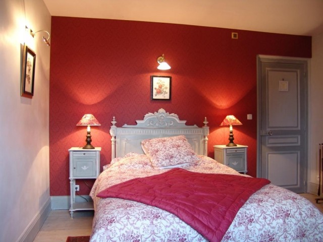 Chant d’Aube : dans les tons rouge, elle ouvre sur la fierté de notre parc, un magnifique hêtre pourpre. Salle de bains avec douche