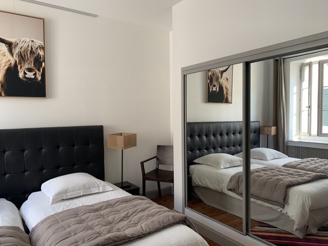 Grande chambre au 2ème étage avec deux lits individuels que l'on peut associer ou espacer, salle de bains avec douche et wc. Autre chambre avec un grand lit de 160cm. Décoration contemporaine. Jolis tissus et ameublement dans les tons de beige, chocolat, wengé. Poste radio. TV écran plat - décodeur satellite TNT.