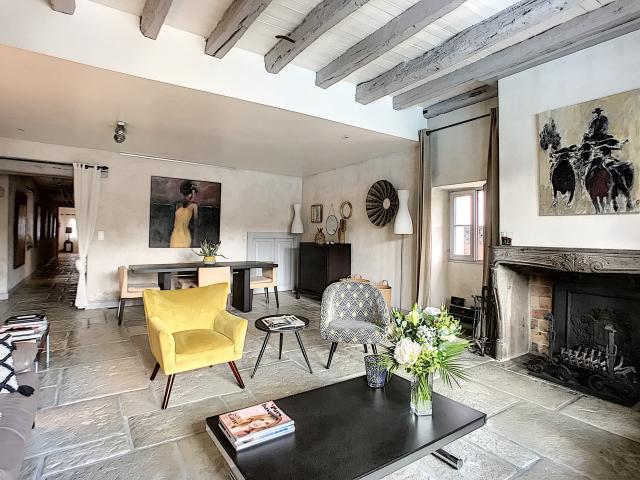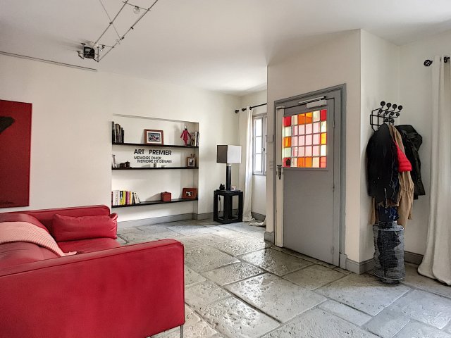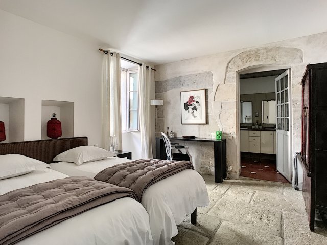 Grande chambre au rez-de-chaussée avec deux lits individuels de 90cm (soit un grand couchage de 180cm) que l'on peut associer ou espacer. Décoration associant l'ancien et le contemporain. Esprit "vieilles pierres". Jolis tissus et ameublement dans les tons de beige, chocolat, wengé, bois ciré. Dalles de pierre cirées au sol. Salle de bains récente avec douche à l'italienne. Carreaux de ciment peints au sol. Poste radio tivoli. TV écran plat - décodeur satellite TNT.