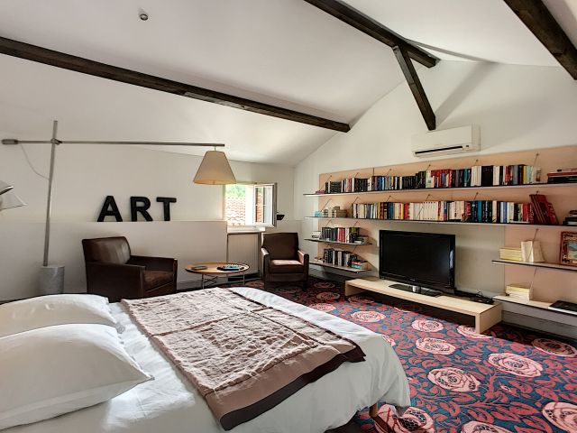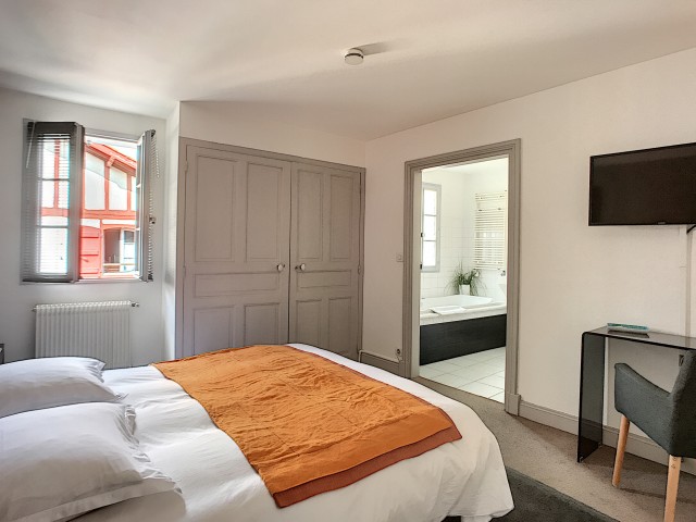 Grande chambre au 1er étage avec un grand lit de 160cm. Décoration contemporaine. Jolis tissus et ameublement dans les tons de gris clair, blanc, chocolat et wengé. Salle de bains avec grande douche. TV écran plat - décodeur satellite TNT.