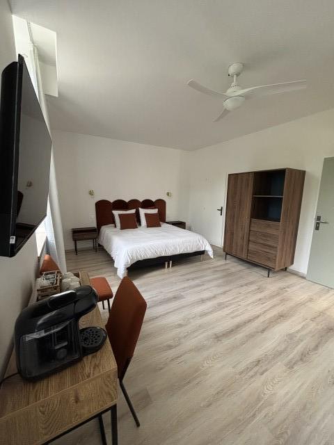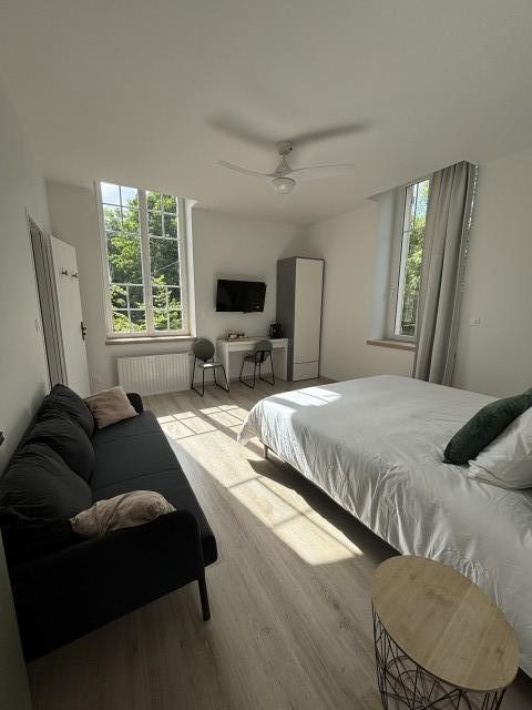 Grande Chambre individuelle composée d'un lit double de 180, d'un canapé, d'une télévision, d'une salle de bain attenante et WC.