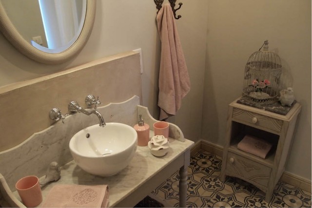 Les tons rose poudré et gris offrent à cette chambre une atmosphère propice au calme et à la détente.