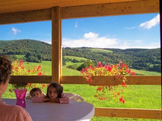 En Auvergne, Cantal, sud région Châtaigneraie, à 30 km Aurillac, au calme, en pleine nature, les gites en bois avec piscine chauffée à la ferme, 3 clévacances, 1 à 6 pers., tout confort, avec terrasse panoramique de 15 m2, sont nichés au coeur d'une prairie de 7 ha arborée et fleurie.