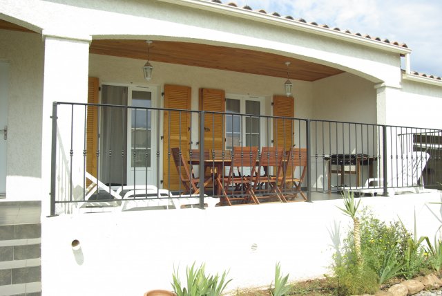 Séjour donnant sur grande terrasse ombragée barbecue point d'eau