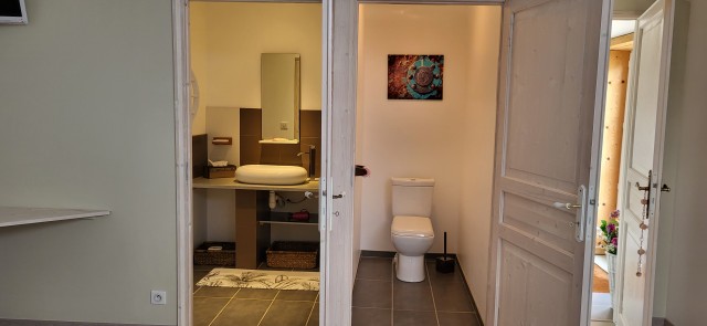 Au rez-de-chaussée, deux chambres d'hôtes aménagées dans les dépendances d'un ancien corps de ferme, entièrement rénovées et climatisées, classées 4 Clés. Chaque chambre dispose d’un lit 160, de sanitaires privatifs (douche, WC séparé). Un séjour/salon est à disposition. Jardin, terrasse, salon de jardin, abri voiture dans la propriété, borne de recharge électrique disponible avec supplément. Accès Wi-Fi dans le séjour et 5G dans les chambres.